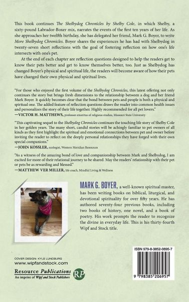 This book continues The Shelbydog Chronicles by Shelby Cole, in which Shelby, a sixty-pound Labrador-Boxer mix, narrates the events of the first ten years of her life. As she approaches her twelfth birthday, she has delegated her friend, Mark G. Boyer, to write More Shelbydog Chronicles. Boyer shares the experiences he has had with Shelbydog in twenty-seven short reflections with the goal of fostering reflection on how one's life intersects with one's pet. At the end of each chapter are reflection questions designed to help the readers get to know their pets better and get to know themselves better, too. Just as Shelbydog has changed Boyer's physical and spiritual life, the readers will become aware of how their pets have changed their own physical and spiritual lives.