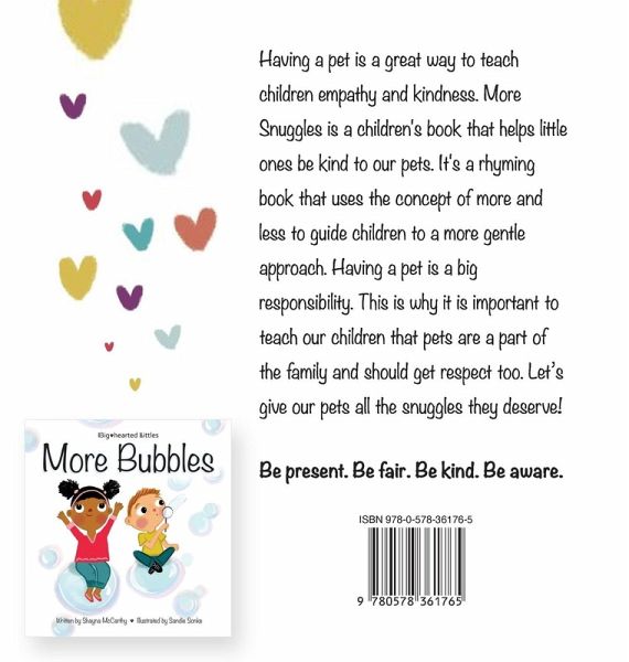 Having a pet is a great way to teach children empathy and kindness. More Snuggles is a children's book that helps little ones be kind to our pets. It's a rhyming book that uses the concept of more and less to guide children to a more gentle approach. It also opens up a discussion on how to care for our pets. What do pets need to be healthy and happy? Food, water, grooming and of course a lot of snuggles! Having a pet is a big responsibility. This is why it is important to teach our children that pets are a part of the family and should get respect too. Let's give our pets all the snuggles they deserve!