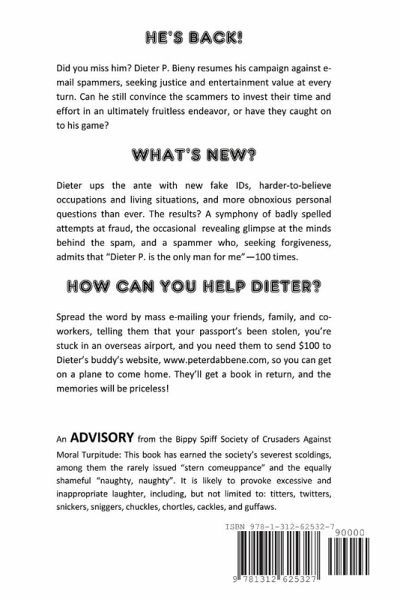 HE'S BACK! Did you miss him? Dieter P. Bieny resumes his campaign against e-mail spammers, seeking justice and entertainment value at every turn. Can he still convince the scammers to invest their time and effort in an ultimately fruitless endeavor, or have they caught on to his game? WHAT'S NEW? Dieter ups the ante with new fake IDs, harder-to-believe occupations and living situations, and more obnoxious personal questions than ever. The results? A symphony of badly spelled attempts at fraud, the occasional revealing glimpse at the minds behind the spam, and a spammer who, seeking forgiveness, admits that "Dieter P. is the only man for me"-100 times.