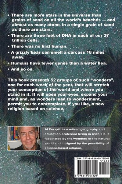 Did you know that there are more stars in the universe than grains of sand on all the world's beaches? Did you know that there are more atoms in a single grain of sand than there are grains of sand and almost as many as the number of stars? Did you know that almost every one of our 37 trillion cells contains three feet of DNA, or enough in total that, if laid end to end, would form a DNA string stretching to Pluto? Did you know that there was no first Homo sapiens? Did you know that a grizzly bear can smell a carcass from 18 miles away? Did you know that the mantis shrimp can see a rainbow of colors unimaginable to us, with its 16 color receptors to our three? Did you know we humans have fewer genes in our cells than a water flea? In More Stars Than Grains of Sand: Wonders, Wonderment-and Religion, Al Forsyth presents a broad range of such surprising "wonders" of the natural and physical world, with color photos of many, to stretch our conception of the world and where humans stand in it. Are we in the middle of spectrums of size, abilities, and other traits, or are we at one extreme or the other? Because so many of the wonders stretch our understanding of the very large and very small, an introductory section of the book helps the reader understand very large and very small numbers, using familiar analogies. The book presents 52 groups of wonders, one for each week of the year. The author strongly urges reading the book slowly, letting the new knowledge presented percolate and deeply affect our thinking about ourselves and the world. As the subtitle of the book suggests, the author makes a strong argument that wonders can promote wonderment, and that wonderment embraces a sense of awe that is basic to religions. In fact, the case is made that appreciation of wonder and the resulting wonderment, combined with adherence to the Golden Rule, are sufficient dimensions of a religion, a new religion based in science that avoids many of the pitfalls of traditional religions. More Stars Than Grains of Sand will open your eyes, expand your mind and help you place yourself in the world - wonders leading to wonderment - and permit you to contemplate, if you like, a new religion based on science.