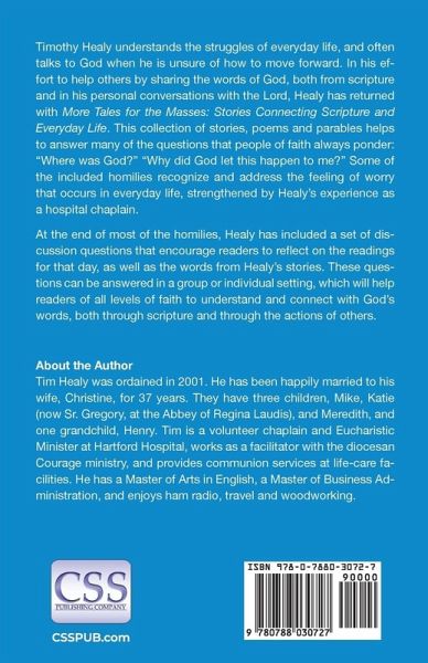 Deacon Timothy Healy understands the struggles of everyday life, and often talks to God when he is unsure of how to move forward. In his effort to help others by sharing the words of God, both from scripture and in his personal conversations with the Lord, Healy has returned with More Tales for the Masses: Stories Connecting Scripture and Everyday Life. This collection of stories, poems and parables helps to answer many of the questions that people of faith always ponder: "Where was God?" "Why did God let this happen to me?" Some of the included homilies recognize and address the feeling of worry that occurs in everyday life, strengthened by Healy's experience as a hospital chaplain. At the end of most of the homilies, Healy has included a set of discussion questions which encourage readers to reflect on the readings for that day, as well as the words from Healy's stories. These questions can be answered in a group or individual setting, which will help readers of all levels of faith to understand and connect with God's words, both through scripture and through the actions of others.