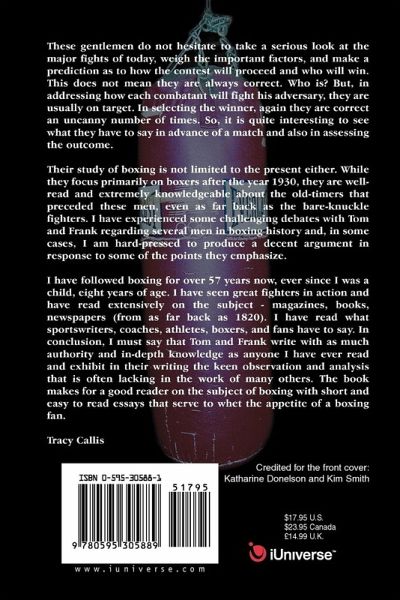 These gentlemen do not hesitate to take a serious look at the major fights of today, weigh the important factors, and make a prediction as to how the contest will proceed and who will win. This does not mean they are always correct. Who is? But in addressing how each combatant will fight his adversary, they are usually on target. In selecting the winner, again they are correct an uncanny number of times. So, it is quite interesting to see what they have to say in advance of a match and also in assessing the outcome. Their study of boxing is not limited to the present either. While they focus primarily on boxers after the year 1930, they are well-read and extremely knowledgeable about the old-timers that preceded these men, even as far back a the bare-knuckle fighters. I have experienced some challenging debates with Tom and Frank regarding several men in boxing history and, in some cases, I am hard-pressed to produce a decent argument in response to some of the points they emphasize. I have followed boxing for over 57 years now, ever since I was a child, eight years of age. I have seen great fighters in action and have read extensively on the subject--magazines, books and newspapers (from as far back as 1820). I have read what sportswriters, coaches, athletes, boxers, and fans have to say. In conclusion, I must say that Tom and Frank write with as much authority and in-depth knowledge as anyone I have read and exhibit in their writing the keen observation and analysis that is often lacking in the work of many others. The book makes for a good reader on the subject of boxing with short and easy to read essays that serve to whet the appetite of a boxing fan. Tracy Callis