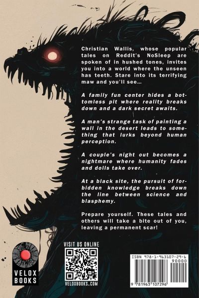 Christian Wallis, whose popular tales on Reddit's NoSleep are spoken of in hushed tones, invites you into a world where the unseen has teeth. Stare into its terrifying maw and you'll see... A family fun center hides a bottomless pit where reality breaks down and a dark secret awaits. A man's strange task of painting a wall in the desert leads to something that lurks beyond human perception. A couple's night out becomes a nightmare where humanity fades and dolls take over. At a black site, the pursuit of forbidden knowledge breaks down the line between science and blasphemy. Prepare yourself. These tales and others will take a bite out of you, leaving a permanent scar!
