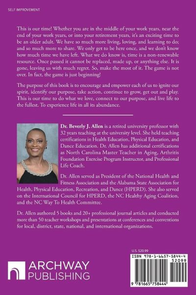 This is our time! Whether you are in the middle of your work years, near the end of your work years, or into your retirement years, it's an exciting time to be an older adult. We have so much more living, loving, and learning to do; and so much more to share. We only get to be here once, and we don't know how much time we have left. What we do know is, time is a non-renewable resource. Once passed it cannot be replaced, made up, or anything else. It is gone, leaving us with much regret. So, make the most of it. The game is not over. In fact, the game is just beginning! The purpose of this book is to encourage and empower each of us to ignite our spirit, identify our purpose, take action, continue to grow, get out and play. This is our time to do what we love, connect to our purpose, and live life to the fullest. To experience life in all its abundance.