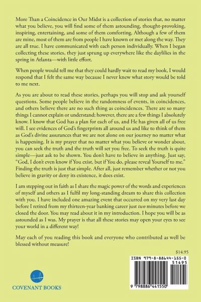 More Than a Coincidence in Our Midst is a collection of stories that, no matter what you believe, you will find some of them astounding, thought-provoking, inspiring, entertaining, and some of them comforting. Although a few of them are mine, most of them are from people I have known or met along the way. They are all true. I have communicated with each person individually. When I began collecting these stories, they just sprung up everywhere like the daylilies in the spring in Atlanta--with little effort. When people would tell me that they could hardly wait to read my book, I would respond that I felt the same way because I never knew what story would be told to me next. As you are about to read these stories, perhaps you will stop and ask yourself questions. Some people believe in the randomness of events, in coincidences, and others believe there are no such thing as coincidences. There are so many things I cannot explain or understand; however, there are a few things I absolutely know. I know that God has a plan for each of us, and He has given all of us free will. I see evidences of God's fingerprints all around us and like to think of them as God's divine assurances that we are not alone on our journey no matter what is happening. It is my prayer that no matter what you believe or wonder about, you can seek the truth and the truth will set you free. To seek the truth is quite simple--just ask to be shown. You don't have to believe in anything. Just say, "God, I don't even know if You exist, but if You do, please reveal Yourself to me." Finding the truth is just that simple. After all, just remember whether or not you believe in gravity or deny its existence, it does exist. I am stepping out in faith as I share the magic power of the words and experiences of myself and others as I fulfil my long-standing dream to share this collection with you. I have included one amazing event that occurred on my very last day before I retired from my thirteen-year banking career just two minutes before we closed the door. You may read about it in my introduction. I hope you will be as astounded as I was. My prayer is that all these stories may open your eyes to see your world in a different way! May each of you reading this book and everyone who contributed as well be blessed without measure!