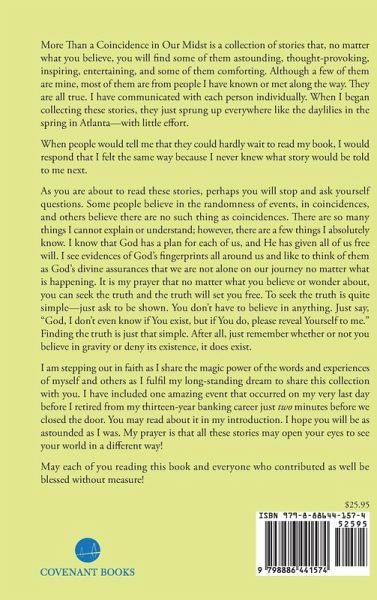 More Than a Coincidence in Our Midst is a collection of stories that, no matter what you believe, you will find some of them astounding, thought-provoking, inspiring, entertaining, and some of them comforting. Although a few of them are mine, most of them are from people I have known or met along the way. They are all true. I have communicated with each person individually. When I began collecting these stories, they just sprung up everywhere like the daylilies in the spring in Atlanta--with little effort. When people would tell me that they could hardly wait to read my book, I would respond that I felt the same way because I never knew what story would be told to me next. As you are about to read these stories, perhaps you will stop and ask yourself questions. Some people believe in the randomness of events, in coincidences, and others believe there are no such thing as coincidences. There are so many things I cannot explain or understand; however, there are a few things I absolutely know. I know that God has a plan for each of us, and He has given all of us free will. I see evidences of God's fingerprints all around us and like to think of them as God's divine assurances that we are not alone on our journey no matter what is happening. It is my prayer that no matter what you believe or wonder about, you can seek the truth and the truth will set you free. To seek the truth is quite simple--just ask to be shown. You don't have to believe in anything. Just say, "God, I don't even know if You exist, but if You do, please reveal Yourself to me." Finding the truth is just that simple. After all, just remember whether or not you believe in gravity or deny its existence, it does exist. I am stepping out in faith as I share the magic power of the words and experiences of myself and others as I fulfil my long-standing dream to share this collection with you. I have included one amazing event that occurred on my very last day before I retired from my thirteen-year banking career just two minutes before we closed the door. You may read about it in my introduction. I hope you will be as astounded as I was. My prayer is that all these stories may open your eyes to see your world in a different way! May each of you reading this book and everyone who contributed as well be blessed without measure!