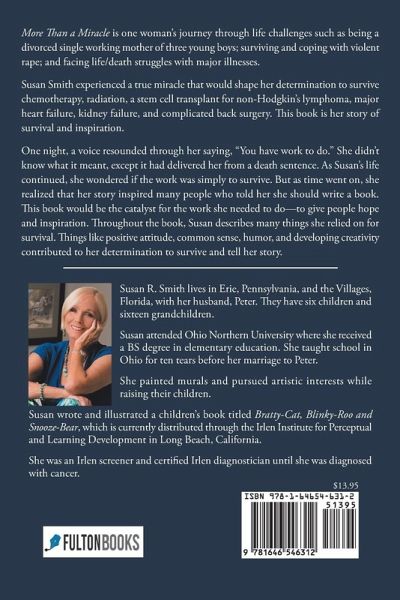 More Than a Miracle is one woman's journey through life challenges such as being a divorced single working mother of three young boys; surviving and coping with violent rape; and facing life/death struggles with major illnesses. Susan Smith experienced a true miracle that would shape her determination to survive chemotherapy, radiation, a stem cell transplant for non-Hodgkin's lymphoma, major heart failure, kidney failure, and complicated back surgery. This book is her story of survival and inspiration. One night, a voice resounded through her saying, "You have work to do." She didn't know what it meant, except it had delivered her from a death sentence. As Susan's life continued, she wondered if the work was simply to survive. But as time went on, she realized that her story inspired many people who told her she should write a book. This book would be the catalyst for the work she needed to do-to give people hope and inspiration. Throughout the book, Susan describes many things she relied on for survival. Things like positive attitude, common sense, humor, and developing creativity contributed to her determination to survive and tell her story.