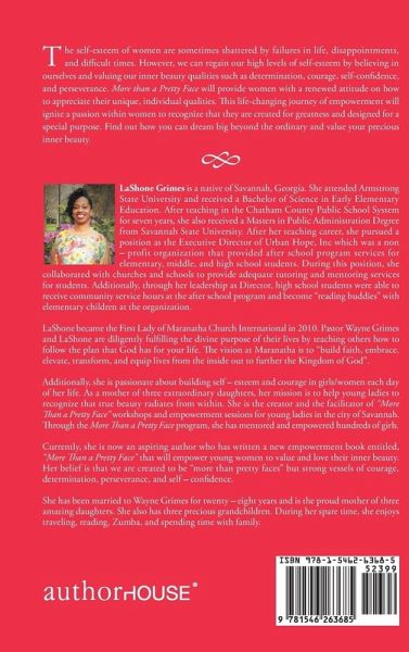 The self-esteem of women are sometimes shattered by failures in life, disappointments, and difficult times. However, we can regain our high levels of self-esteem by believing in ourselves and valuing our inner beauty qualities such as determination, courage, self-confidence, and perseverance. More than a Pretty Face will provide women with a renewed attitude on how to appreciate their unique, individual qualities. This life-changing journey of empowerment will ignite a passion within women to recognize that they are created for greatness and designed for a special purpose. Find out how you can dream big beyond the ordinary and value your precious inner beauty.