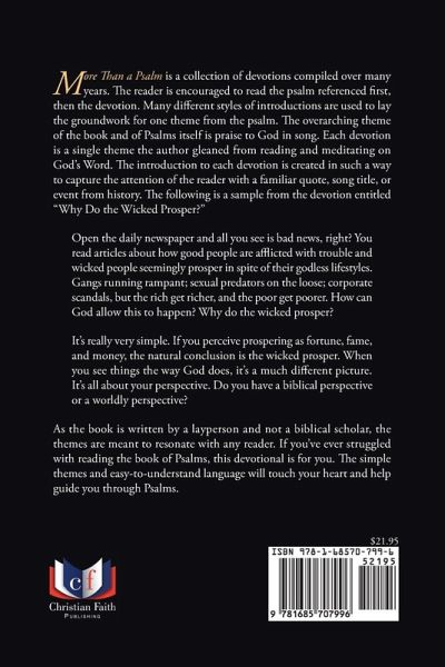 More Than a Psalm is a collection of devotions compiled over many years. The reader is encouraged to read the psalm referenced first, then the devotion. Many different styles of introductions are used to lay the groundwork for one theme from the psalm. The overarching theme of the book and of Psalms itself is praise to God in song. Each devotion is a single theme the author gleaned from reading and meditating on God's Word. The introduction to each devotion is created in such a way to capture the attention of the reader with a familiar quote, song title, or event from history. The following is a sample from the devotion entitled "Why Do the Wicked Prosper?" Open the daily newspaper and all you see is bad news, right? You read articles about how good people are afflicted with trouble and wicked people seemingly prosper in spite of their godless lifestyles. Gangs running rampant; sexual predators on the loose; corporate scandals, but the rich get richer, and the poor get poorer. How can God allow this to happen? Why do the wicked prosper? It's really very simple. If you perceive prospering as fortune, fame, and money, the natural conclusion is the wicked prosper. When you see things the way God does, it's a much different picture. It's all about your perspective. Do you have a biblical perspective or a worldly perspective? As the book is written by a layperson and not a biblical scholar, the themes are meant to resonate with any reader. If you've ever struggled with reading the book of Psalms, this devotional is for you. The simple themes and easy-to-understand language will touch your heart and help guide you through Psalms.