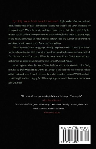 Ivy Holly Moore finds herself a widowed, single mother after her husband, Aaron, is killed while on duty. She thinks she's coping well until her son, Gavin, asks Santa for an impossible gift. When Santa fails to deliver, Gavin loses his faith, but a gift left for her restores Ivy's. With Gavin's acceptance into a private school, Ivy has to find some way to pay for the tuition. Encouraged by Aaron's former partner, Alex, she puts out an advertisement to rent out the attic room she and Aaron never moved into. Aldwin Nicholas Claus is struggling to develop the powers needed to take up his father's mantle as Santa. In a last ditch attempt to make them manifest, he needs to restore the faith of a child who lost their's too soon. When the magic draws him to Gavin's letter, he knows the future of his legacy awaits him in the small town of Ostcrest, Kansas. What happens when the son of Santa finds himself on the door-step of a family fractured by grief? Will he find a way to get through to the child who has cocooned himself safely in logic and reason? Can Ivy let go of the grief of losing her husband? Will Gavin finally receive the gift he's been longing for? When cupids get involved, it becomes about far more than Christmas.