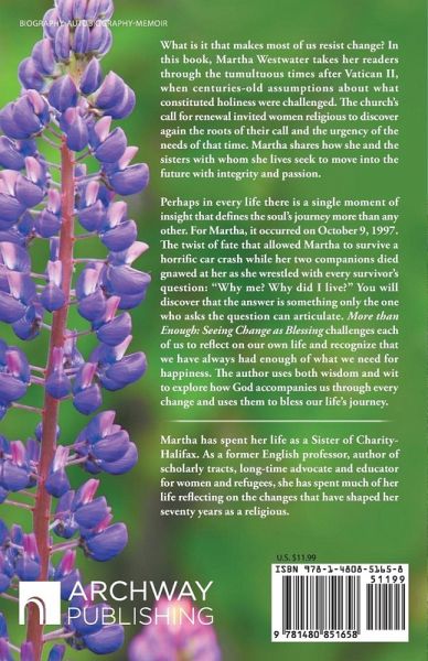 What is it that makes most of us resist change? In this book, Martha Westwater takes her readers through the tumultuous times after Vatican II, when centuries-old assumptions about what constituted holiness were challenged. The church's call for renewal invited women religious to discover again the roots of their call and the urgency of the needs of that time. Martha shares how she and the sisters with whom she lives seek to move into the future with integrity and passion. Perhaps in every life there is a single moment of insight that defines the soul's journey more than any other. For Martha, it occurred on October 9, 1997. The twist of fate that allowed Martha to survive a horrific car crash while her two companions died gnawed at her as she wrestled with every survivor's question: "Why me? Why did I live?" You will discover that the answer is something only the one who asks the question can articulate. More than Enough: Seeing Change as Blessing challenges each of us to reflect on our own life and recognize that we have always had enough of what we need for happiness. The author uses both wisdom and wit to explore how God accompanies us through every change and uses them to bless our life's journey.