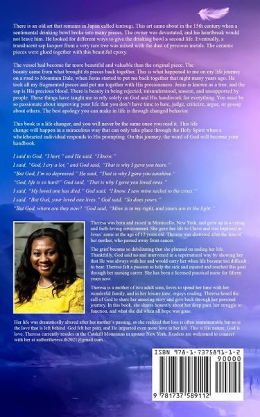 There is an old art that remains in Japan called kintsugi. This art came about in the 15th century when a sentimental drinking bowl broke into many pieces. The owner was devastated, and his heartbreak would not leave him. He looked for different ways to give the drinking bowl a second life. Eventually, a translucent sap lacquer from a very rare tree was mixed with the dust of precious metals. The ceramic pieces were glued together with this beautiful epoxy. The vessel had become far more beautiful and valuable than the original piece. The beauty came from what brought its pieces back together. This is what happened to me on my life journey on a road to Mountain Dale, when Jesus started to put me back together that night many years ago. He took all my fragmented pieces and put me together with His preciousness. Jesus is known as a tree, and the sap is His precious blood. There is beauty in being rejected, misunderstood, unseen, and unsupported by people. These things have taught me to rely solely on God and His handiwork for everything. You must be so passionate about improving your life that you don't have time to hate, judge, criticize, argue, or gossip about others. The best apology you can make in life is through changed behavior. This book is a life changer, and you will never be the same once you read it. This life change will happen in a miraculous way that can only take place through the Holy Spirit when a wholehearted individual responds to His prompting. On this journey, the word of God will become your handbook. I said to God, "I hurt," and He said, "I know." I said, "God, I cry a lot," and God said, "That is why I gave you tears." "But God, I'm so depressed." He said, "That is why I gave you sunshine." "God, life is so hard!" God said, "That is why I gave you loved ones." I said, "My loved one has died." God said, "I know. I saw mine nailed to the cross." I said, "But God, your loved one lives." God said, "So does yours." "But God, where are they now?" God said, "Mine is to my right, and yours are in the light." I said, "But it hurts." God said, "I know, but I will never leave you, nor will I forsake you