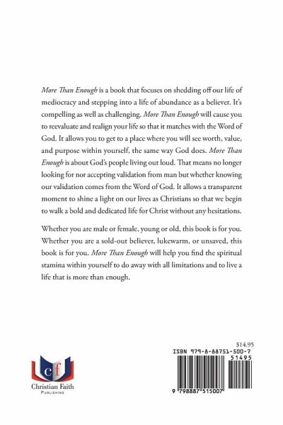 More Than Enough is a book that focuses on shedding off our life of mediocracy and stepping into a life of abundance as a believer. It's compelling as well as challenging. More Than Enough will cause you to reevaluate and realign your life so that it matches with the Word of God. It allows you to get to a place where you will see worth, value, and purpose within yourself, the same way God does. More Than Enough is about God's people living out loud. That means no longer looking for nor accepting validation from man but whether knowing our validation comes from the Word of God. It allows a transparent moment to shine a light on our lives as Christians so that we begin to walk a bold and dedicated life for Christ without any hesitations. Whether you are male or female, young or old, this book is for you. Whether you are a sold-out believer, lukewarm, or unsaved, this book is for you. More Than Enough will help you find the spiritual stamina within yourself to do away with all limitations and to live a life that is more than enough.