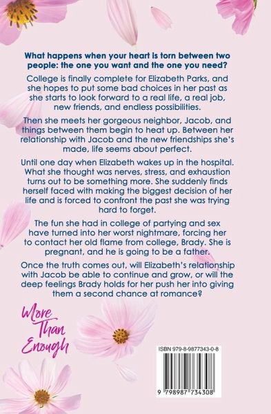 What happens when your heart is torn between two people: The one you want and the one you need? College is finally complete for Elizabeth Parks. She is looking forward to a real life, a real job, new friends, and endless possibilities. Then she meets her gorgeous neighbor, Jacob, and things start heating up. Between her relationship with Jacob, and new friendships she has made, life seems about perfect. Until one day when Elizabeth wakes up in the hospital. What she thought was nerves, stress, and exhaustion turns out to be something more. Elizabeth finds herself faced with making the biggest decision of her life. Being forced to confront the past she was trying hard to forget, she contacts her old flame from college, Brady, to let him know he is going to be a father. Once the truth comes out, will Elizabeth's relationship with Jacob be able to continue and grow, or will the feelings Brady holds for her push her in a different direction? Will she find the love her heart desires, or be forced to put the needs of the little one growing inside of her, over her own? If you love reading a feel good romance with a happy-for-now ending, a good level of steam, with a female protagonist who digs deep to find herself, More Than Enough will deliver.