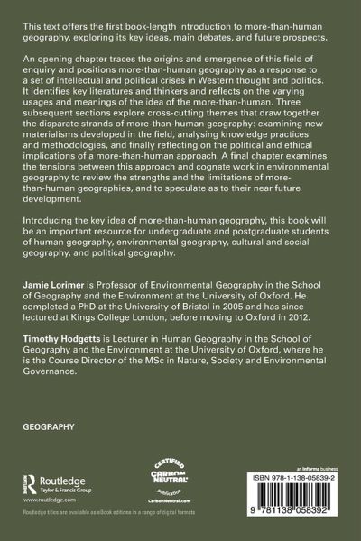 An opening chapter traces the origins and emergence of this field of enquiry and positions more-than-human geography as a response to a set of intellectual and political crises in Western thought and politics. It identifies key literatures and thinkers and reflects on the varying usages and meanings of the idea of the more-than-human. Three subsequent sections explore cross-cutting themes that draw together the disparate strands of more-than-human geography: examining new materialisms developed in the field, analysing knowledge practices and methodologies, and finally reflecting on the political and ethical implications of a more-than-human approach. A final chapter examines the tensions between this approach and cognate work in environmental geography to review the strengths and the limitations of more-than-human geographies, and to speculate as to their near future development.