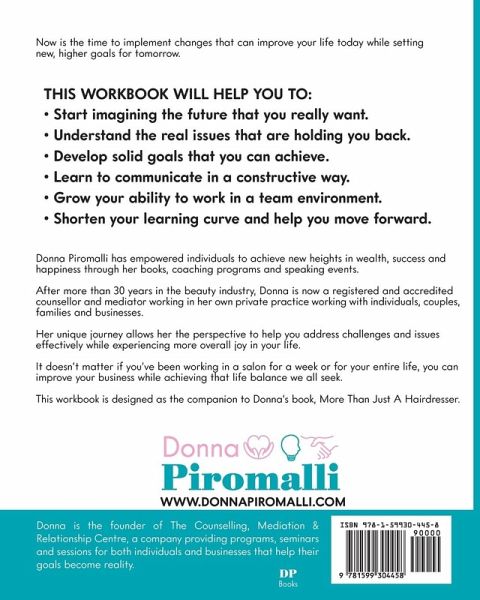 Now is the time to implement changes that can improve your life today while setting new, higher goals for tomorrow. THIS WORKBOOK WILL HELP YOU TO: ¿ Start imagining the future that you really want. ¿ Understand the real issues that are holding you back. ¿ Develop solid goals that you can achieve. ¿ Learn to communicate in a constructive way. ¿ Grow your ability to work in a team environment. ¿ Shorten your learning curve and help you move forward. Donna Piromalli has empowered individuals to achieve new heights in wealth, success and happiness through her books, coaching programs and speaking events. After more than 30 years in the beauty industry, Donna is now a registered and accredited counsellor and mediator working in her own private practice working with individuals, couples, families and businesses. Her unique journey allows her the perspective to help you address challenges and issues effectively while experiencing more overall joy in your life. It doesn't matter if you've been working in a salon for a week or for your entire life, you can improve your business while achieving that life balance we all seek. This workbook is designed as the companion to Donna's book, More Than Just A Hairdresser.