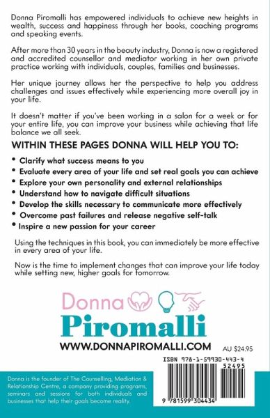 Donna Piromalli has empowered individuals to achieve new heights in wealth, success and happiness through her books, coaching programs and speaking events. After more than 30 years in the beauty industry, Donna is now a registered and accredited counsellor and mediator working in her own private practice working with individuals, couples, families and businesses. Her unique journey allows her the perspective to help you address challenges and issues effectively while experiencing more overall joy in your life. It doesn't matter if you've been working in a salon for a week or for your entire life, you can improve your business while achieving that life balance we all seek. WITHIN THESE PAGES DONNA WILL HELP YOU TO: • Clarify what success means to you • Evaluate every area of your life and set real goals you can achieve • Explore your own personality and external relationships • Understand how to navigate difficult situations • Develop the skills necessary to communicate more effectively • Overcome past failures and release negative self-talk • Inspire a new passion for your career Using the techniques in this book, you can immediately be more effective in every area of your life. Now is the time to implement changes that can improve your life today while setting new, higher goals for tomorrow.