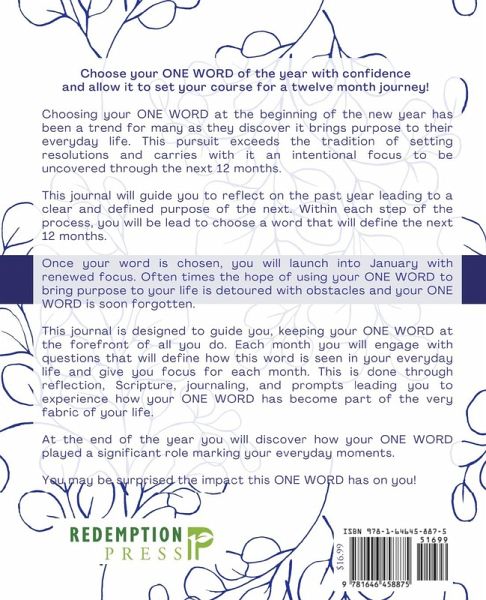 Choose your ONE WORD of the year with confidence and allow it to set your course for a twelve month journey! Choosing your ONE WORD at the beginning of the new year has been a trend for many as they discover it brings purpose to their everyday life. This pursuit exceeds the tradition of setting resolutions and carries with it an intentional focus to be uncovered through the next 12 months. This journal will guide you to reflect on the past year leading to a clear and defined purpose of the next. Within each step of the process, you will be lead to choose a word that will define the next 12 months. Once your word is chosen, you will launch, into January with renewed focus. Often times the hope of using your ONE WORD to bring purpose to your life is detoured with obstacles and your ONE WORD is soon forgotten. This journal is designed to guide you, keeping your ONE WORD at the forefront of all you do. Each month you will engage with questions that will define how this word is seen in your everyday life and give you focus for each month. This is done through reflection, Scripture, journaling, and prompts leading you to experience how your ONE WORD has become part of the very fabric of your life. At the end of the year you will discover how your ONE WORD played a significant role marking your everyday moments. You may be surprised the impact this ONE WORD has on you!