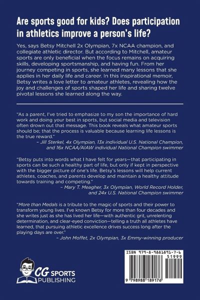 Are sports good for kids? Does participation in athletics improve a person's life? Yes, according to Betsy Mitchell, a collegiate athletic director and two-time Olympian, medalist, world champion, record holder, and seven-time NCAA champion swimmer. But according to Mitchell, amateur sports are only beneficial when the focus remains on acquiring skills, developing sportsmanship, and having fun. From her journey competing in sports, she learned many lessons that she applies in her daily life and career. In this inspirational memoir, Betsy writes a love letter to amateur athletes, revealing how the joy and challenges of sports shaped her life and sharing twelve pivotal lessons she learned along the way. "Even as a teenager, I understood that swimming occupied only a part of my life; it was not my whole life. At some point in the future, I would stop swimming and continue with every other aspect of myself."