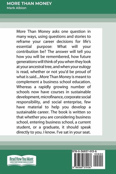 More Than Money asks one question in many ways, using questions and stories to reframe your career decisions for life's essential purpose: What will your contribution be? The answer will tell you how you will be remembered, how future generations will think of you when they look at your ancestral tree, and when your eulogy is read, whether or not you'd be proud of what is said....More Than Money is meant to complement a business school education. Whereas a rapidly growing number of schools now have courses in sustainable development, microfinance, corporate social responsibility, and social enterprise, few have material to help you develop a sustainable career. The book is written so that whether you are considering business school, entering business school, a current student, or a graduate, it should speak directly to you. I know. I've sat in your seat.
