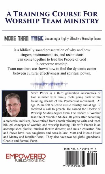 A Training Course for Worship Team Ministry. More than Music: Becoming a Highly Effective Worship Team is a biblically sound presentation of why and how singers, instrumentalists, and technicians can find the dynamic center between cultural effectiveness and spiritual power. More than Music: Becoming a Highly Effective Worship Team focuses on the fundamental and perennial challenges of worship team ministry. Because worship is expressed by culture, these two things become almost inseparable in our thinking, but separate them we must. Culture is temporary, and worship is eternal; it is essential for an effective worship team to constantly monitor these differences. The book is written in two sections: 1. The Biblical Study of Worship, 2. The Biblical Study of Worship Leading. The biblical instructions and principles of worship are eternal and absolute, applicable to all cultures. The local praxis of worship leading is temporary and relative, applicable in one place at one time. More Than Worship clearly sets forth the differences between the two. The Biblical Study of Worship. The first half of the book explores biblical terminology and models of worship. The reader is introduced to the original biblical meanings of important worship terms: • Worship in Spirit and Truth, • Psalms, hymns, and spiritual songs • Praise and worship. Seven biblical models of worship are presented which illustrate vital and universal aspects of worship. • The structure of worship • The identity of worshipers • The function of worshipers • The Throne of God in worship • The Office-place of God in worship • The flow of the River of Life through worship. The Biblical Study of Worship Leading. The second half of the book applies these truths to the ministry of the worship team. This book is not about the style of music or of technical presentations. More Than Music points out the eternal things so that the temporary things can be clearly seen. These biblical principles and instructions can be useful across cultural divides. Topics explored in the second half of the book are: • The Leadership of the Holy Spirit • The Heart of the True Worshiper • The Call of God to lead worship • Finding the Dynamic Center between competing demands • An Effective Prayer Life • Continuing the work of Worship Renewal into the next generation. Becoming a Highly Effective Worship Team Being on a worship team should be a delight and not a burden. Problems plaguing worship teams can be solved as the Holy Spirit does His work through the application of the Word in our hearts. More than Music is designed as a 12-week study course. Each chapter can be read by team members before the class session and then taught by the worship leader. At the close of each chapter, there are seven discussion statements/questions to help the team process the truths presented. Plans for Use: • A 12 week Sunday School-type of class • A year-long monthly teaching fellowship • A personal study by each team member • Weekly chapter readings with rehearsal devotions discussing the end of the chapter study questions • A supplemental text in college and seminar classrooms studying the ministry of the worship team and worship leader.