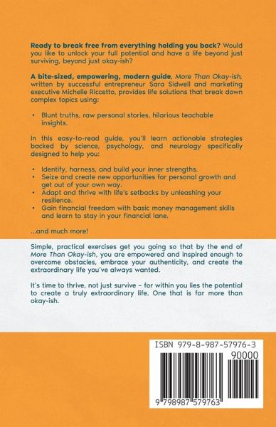 *Previously published as How to Get Your Shift (minus the 'f') Together – Updated Dear Reader & Preface sections. An Unorthodox – but Effective! – Approach to Self-Help (and Achieving Your Dreams) What if you could break free from everything holding you back (including yourself)? What if you were able to align your values, goals, and actions? How would it feel if you could finally get and stay ahead financially? Sara Sidwell has held executive-level positions for over three decades as a top-tier analyst. As an entrepreneur, she served as the CFO for two thriving startup businesses in the transportation and construction industry. Michelle Riccetto has a BA from the University of Texas and an MBA from the University of Boston and is currently a marketing executive at a leading creative agency in Canada. Together, they draw from their raw, firsthand experiences, providing insights and exercises that will teach you the skills to break free from daily struggles that leave you feeling stuck—your ideals, actions, and goals out of alignment. All written in a non-judgmental style designed to make you laugh, cry, reflect, and grow. You are not born with all the knowledge and skills you need to succeed. Like how to walk, talk, or ride a bike, it's something you learn through trial and error. In More Than Okay-ish, a bite-sized, empowering, modern guide, you will learn actionable strategies and skills backed by experience and scientific data, including the keys to: Identifying and capitalizing on your inner strengths (You have more than you realize. Staying authentic, being resilient, and keeping going when things get tough. Overcoming common obstacles blocking you from success by utilizing new personal growth tactics. Snatching back control of your finances and creating a solid financial foundation for the future. Creating, not waiting for new opportunities to switch careers or become an entrepreneur. Standing up for what's right for you on your terms. Avoiding the dangerous impact of stress and FOMO on decision-making. …plus, easy-to-follow chapter exercises specifically designed to get you going. The Guide: sharp wit + blunt truths + relatable stories + actionable strategies = measurable results With More Than Okay-ish, get the key skills you need to empower yourself to take control of your life, unleash your inner strength, and remain authentic as you create the future you've always envisioned. Isn't it time to create an intentional life that's More Than Okay-ish? Grab your copy today.