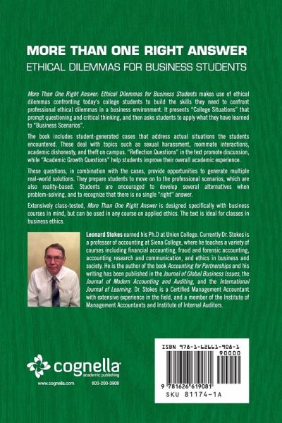 More Than One Right Answer: Ethical Dilemmas for Business Students makes use of ethical dilemmas confronting today's college students to build the skills they need to confront professional ethical dilemmas in a business environment. It presents “College Situations” that prompt questioning and critical thinking, and then asks students to apply what they have learned to “Business Scenarios”. The book includes student-generated cases that address actual situations the students encountered. These deal with topics such as sexual harassment, roommate interactions, academic dishonesty, and theft on campus. “Reflection Questions” in the text promote discussion, while “Academic Growth Questions” help students improve their overall academic experience. These questions, in combination with the cases, provide opportunities to generate multiple real-world solutions. They prepare students to move on to the professional scenarios, which are also reality-based. Students are encouraged to develop several alternatives when problem-solving, and to recognize that there is no single “right” answer. Extensively class-tested, More Than One Right Answer is designed specifically with business courses in mind, but can be used in any course on applied ethics. The text is ideal for classes in business ethics.