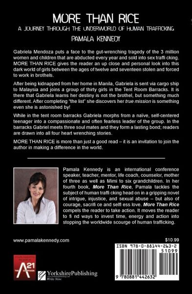 Gabriela Mendoza puts a face to the gut-wrenching tragedy of the 3 million women and children that are abducted every year and sold into human sex trafficking. MORE THAN RICE gives the reader an up close and personal look into this dark world of girls between the ages of twelve and seventeen stolen and forced to work in brothels. After being kidnapped from her home in Manila, Gabriela is sent via cargo ship to Malaysia and joins a group of thirty girls in the Tent Room Barracks. It is there that Gabriela learns her destiny is not the brothel, but something much different. After completing "the list" she discovers her true mission is something even she is astonished by! While in the tent room barracks Gabriela morphs from a naïve, self-centered teenager into a compassionate and often fearless leader of the group. In the barracks Gabriel meets three soul mates and they form a lasting bond; readers are drawn into all four heart wrenching stories. MORE THAN RICE is more than just a good read - it is an invitation to join the author in making a difference in the world.