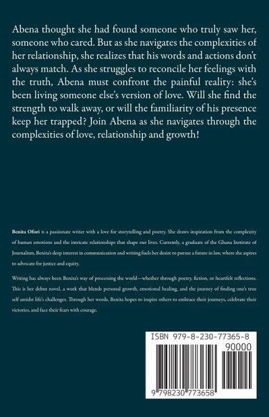 Abena thought she had found someone who truly saw her, someone who cared. But as she navigates the complexities of her relationship, she realizes that his words and actions don't always match. As she struggles to reconcile her feelings with the truth, Abena must confront the painful reality: she's been living someone else's version of love. Will she find the strength to walk away, or will the familiarity of his presence keep her trapped? Join Abena as she navigates through the complexities of love, relationship and growth!