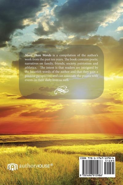 More Than Words is a compilation of the author's work from the past ten years. The book contains poetic narratives on family, friends, society, patriotism and athletics. The intent is that readers are intrigued by the heartfelt words of the author and that they gain a positive perspective and can associate the poems with events in their daily lives as well.