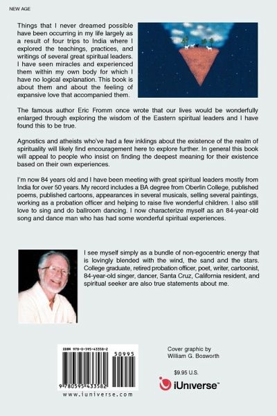 Things that I never dreamed possible have been occurring in my life largely as a result of four trips to India where I explored the teachings, practices, and writings of several great spiritual leaders. I have seen miracles and experienced them within my own body for which I have no logical explanation. This book is about them and about the feeling of expansive love that accompanied them. The famous author Eric Fromm once wrote that our lives would be wonderfully enlarged through exploring the wisdom of the Eastern spiritual leaders and I have found this to be true. Agnostics and atheists who've had a few inklings about the existence of the realm of spirituality will likely find encouragement here to explore further. In general this book will appeal to people who insist on finding the deepest meaning for their existence based on their own experiences. I'm now 83 years old and I have been meeting with great spiritual leaders mostly from India for over 50 years. My record includes a BA degree from Oberlin College, published poems, published cartoons, appearances in several musicals, selling several paintings, working as a probation officer and helping to raise five wonderful children. I also still love to sing and do ballroom dancing. I now characterize myself as an 83-year-old song and dance man who has had some wonderful spiritual experiences.