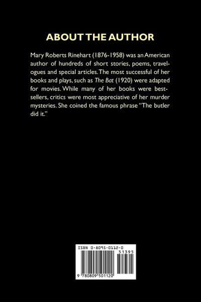 Mary Roberts Rinehart (1876-1958) was an American author of hundreds of short stories, poems, travelogues and special articles. Some of her very successful books and plays, such as "The Bat" (1920) were adapted for movies. While many of her books were best-sellers, critics were most appreciative of her murder mysteries. She also coined the famous phrase "The butler did it."