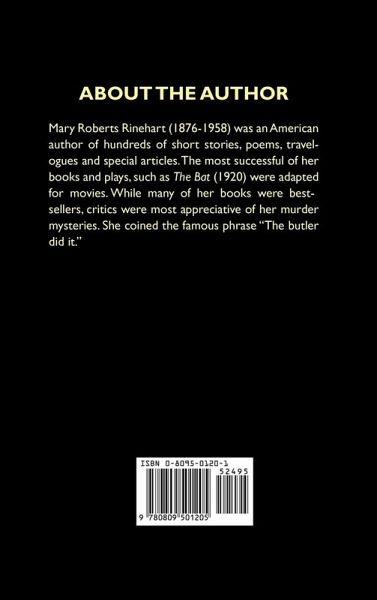 Mary Roberts Rinehart (1876-1958) was an American author of hundreds of short stories, poems, travelogues and special articles. Some of her very successful books and plays, such as "The Bat" (1920) were adapted for movies. While many of her books were best-sellers, critics were most appreciative of her murder mysteries. She also coined the famous phrase "The butler did it."