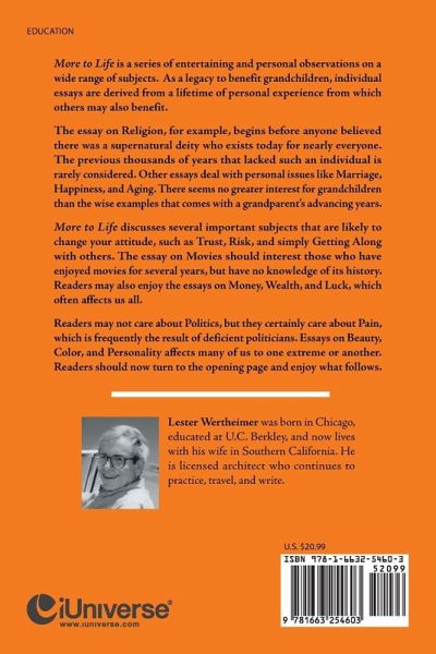 More to Life is a series of entertaining and personal observations on a wide range of subjects. As a legacy to benefit grandchildren, individual essays are derived from a lifetime of personal experience from which others may also benefit. The essay on Religion, for example, begins before anyone believed there was a supernatural deity who exists today for nearly everyone. The previous thousands of years that lacked such an individual is rarely considered. Other essays deal with personal issues like Marriage, Happiness, and Aging. There seems no greater interest for grandchildren than the wise examples that comes with a grandparent's advancing years. More to Life discusses several important subjects that are likely to change your attitude, such as Trust, Risk, and simply Getting Along with others. The essay on Movies should interest those who have enjoyed movies for several years, but have no knowledge of its history. Readers may also enjoy the essays on Money, Wealth, and Luck, which often affects us all. Readers may not care about Politics, but they certainly care about Pain, which is frequently the result of deficient politicians. Essays on Beauty, Color, and Personality affects many of us to one extreme or another. Readers should now turn to the opening page and enjoy what follows.