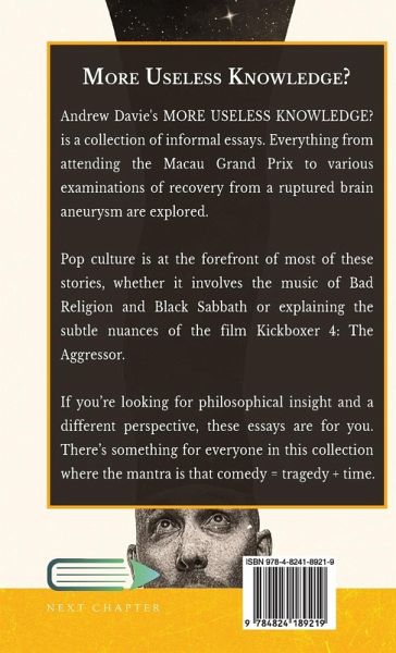 Andrew Davie's MORE USELESS KNOWLEDGE? is a collection of informal essays. Everything from attending the Macau Grand Prix to various examinations of recovery from a ruptured brain aneurysm are explored. Pop culture is at the forefront of most of these stories, whether it involves the music of Bad Religion and Black Sabbath or explaining the subtle nuances of the film Kickboxer 4: The Aggressor. If you're looking for philosophical insight and a different perspective, these essays are for you. There's something for everyone in this collection where the mantra is that comedy = tragedy + time.