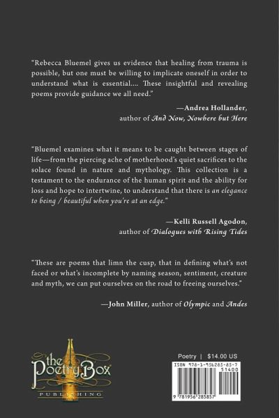 What is the process of relearning and redefining oneself when one's world falls apart? This collection of poetry travels one view of a life that shatters into new life amidst trauma and examines what needs allowance and gentleness to heal and grow. In such a state of growth, these poems attempt to remind the reader that it is ok to cry, but to also remember to have more water than tears. ------- More Water Than Tears by Rebecca Bleumel is an exploration of transformation, grief, and resilience that celebrates the strength in vulnerability and the beauty of fragility. Through poetic meditations beginning with "speak to me of the cocoon" Bluemel examines what it means to be caught between stages of life-from the piercing ache of motherhood's quiet sacrifices to the solace found in nature and mythology. This collection is a testament to the endurance of the human spirit and the ability for loss and hope to intertwine, to understand that there is "an elegance to being / beautiful when you're at an edge." -Kelli Russell Agodon, author of Dialogues with Rising Tides