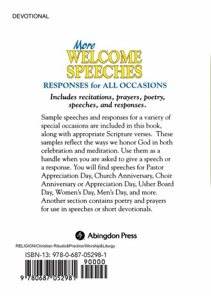 Sample speeches and responses for a variety of special occasions are included in this book, along with appropriate Scripture verses. These samples reflect the ways we honor God in both celebration and meditation. Use them as a handle when you are asked to give a speech or a response. You will find speeches for Pastor Appreciation Day, Men's Day, and Usher Board Day, Women's Day, Men's Day, and more. Another section contains poetry and prayers for use in speeches or short devotionals.