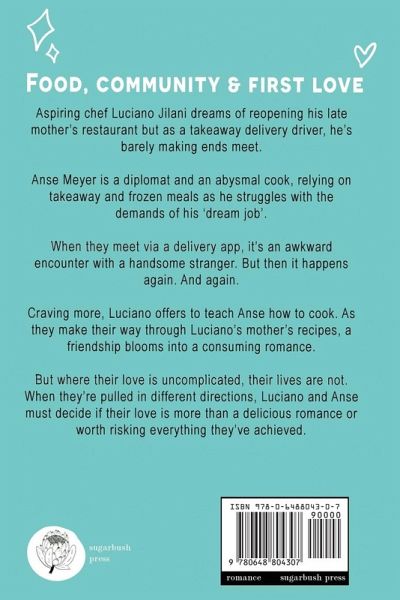 A feel-good Australian romance about food, community and first love nestled in the suburbs of Canberra, Australia. Aspiring chef Luciano Jilani dreams of reopening his late mother's restaurant, but as a takeaway delivery driver, he's barely making ends meet.Anse Meyer is a diplomat and an abysmal cook, relying on takeaway and frozen meals as he struggles with the demands of his 'dream job'.When they meet via the delivery app, it's an awkward encounter with a handsome stranger. But then it happens again. And again.Craving more, Luciano offers to teach Anse how to cook. As they make their way through Luciano's mother's recipes, fledging friendship blooms into a consuming romance.But where their love is uncomplicated, their lives are not. When they're pulled in different directions, Luciano and Anse must decide if their love is more than a delicious romance or worth risking everything they've achieved.