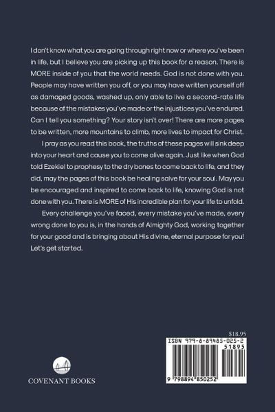 I don't know what you are going through right now or where you've been in life, but I believe you are picking up this book for a reason. There is MORE inside of you that the world needs. God is not done with you. People may have written you off, or you may have written yourself off as damaged goods, washed up, only able to live a second-rate life because of the mistakes you've made or the injustices you've endured. Can I tell you something? Your story isn't over! There are more pages to be written, more mountains to climb, more lives to impact for Christ. I pray as you read this book, the truths of these pages will sink deep into your heart and cause you to come alive again. Just like when God told Ezekiel to prophesy to the dry bones to come back to life, and they did, may the pages of this book be healing salve for your soul. May you be encouraged and inspired to come back to life, knowing God is not done with you. There is MORE of His incredible plan for your life to unfold. Every challenge you've faced, every mistake you've made, every wrong done to you is, in the hands of Almighty God, working together for your good and is bringing about His divine, eternal purpose for you! Let's get started.