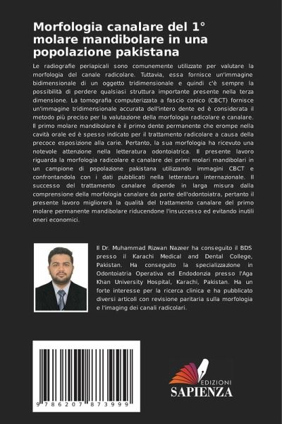 Le radiografie periapicali sono comunemente utilizzate per valutare la morfologia del canale radicolare. Tuttavia, essa fornisce un'immagine bidimensionale di un oggetto tridimensionale e quindi c'è sempre la possibilità di perdere qualsiasi struttura importante presente nella terza dimensione. La tomografia computerizzata a fascio conico (CBCT) fornisce un'immagine tridimensionale accurata dell'intero dente ed è considerata il metodo più preciso per la valutazione della morfologia radicolare e canalare. Il primo molare mandibolare è il primo dente permanente che erompe nella cavità orale ed è spesso indicato per il trattamento radicolare a causa della precoce esposizione alla carie. Pertanto, la sua morfologia ha ricevuto una notevole attenzione nella letteratura odontoiatrica. Il presente lavoro riguarda la morfologia radicolare e canalare dei primi molari mandibolari in un campione di popolazione pakistana utilizzando immagini CBCT e confrontandola con i dati pubblicati nella letteratura internazionale. Il successo del trattamento canalare dipende in larga misura dalla comprensione della morfologia canalare da parte dell'odontoiatra, pertanto il presente lavoro migliorerà la qualità del trattamento canalare del primo molare permanente mandibolare riducendone l'insuccesso ed evitando inutili oneri economici.