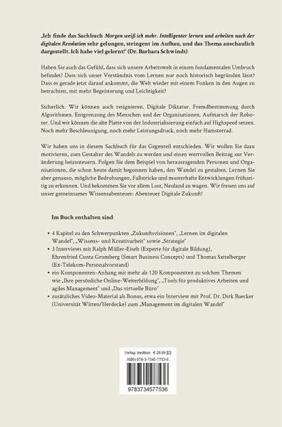Wir haben uns in diesem Sachbuch für das Gegenteil entschieden. Wir wollen Sie dazu motivieren, zum Gestalter dieses Wandels zu werden und einen wertvollen Beitrag zur Veränderung beizutragen. Folgen Sie dem Beispiel von herausragenden Personen und Organisationen, die schon heute damit begonnen haben, den Wandel zu gestalten. Lernen Sie aber genauso, mögliche Bedrohungen, Fallstricke und musterhafte Entwicklungen frühzeitig zu erkennen. Und bekommen Sie vor allem Lust, Neuland zu wagen. Wir freuen uns auf unser gemeinsames Wissensabenteuer: Abenteuer Digitale Zukunft!