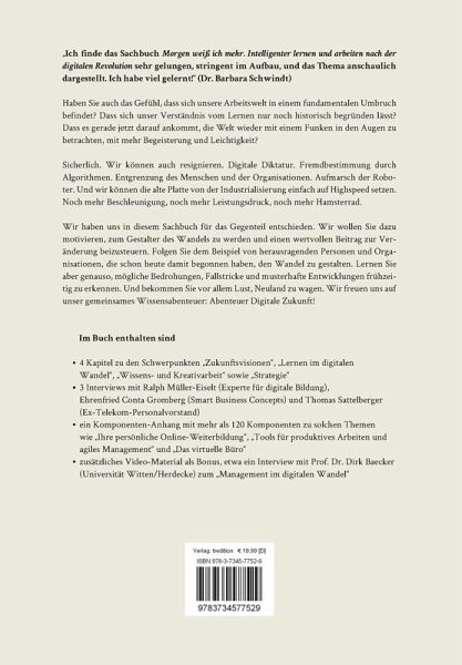 Wir haben uns in diesem Sachbuch für das Gegenteil entschieden. Wir wollen Sie dazu motivieren, zum Gestalter dieses Wandels zu werden und einen wertvollen Beitrag zur Veränderung beizutragen. Folgen Sie dem Beispiel von herausragenden Personen und Organisationen, die schon heute damit begonnen haben, den Wandel zu gestalten. Lernen Sie aber genauso, mögliche Bedrohungen, Fallstricke und musterhafte Entwicklungen frühzeitig zu erkennen. Und bekommen Sie vor allem Lust, Neuland zu wagen. Wir freuen uns auf unser gemeinsames Wissensabenteuer: Abenteuer Digitale Zukunft!