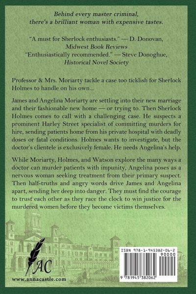 James and Angelina Moriarty are settling into their new marriage and their fashionable new home — or trying to. But James has too little to occupy his mind and Angelina has too many secrets pressing on her heart. They fear they’ll never learn to live together. Then Sherlock Holmes comes to call with a challenging case. He suspects a prominent Harley Street specialist of committing murders for hire, sending patients home from his private hospital with deadly doses or fatal conditions. Holmes intends to investigate, but the doctor’s clientele is exclusively female. He needs Angelina’s help. While Moriarty, Holmes, and Watson explore the alarming number of ways a doctor can murder his patients with impunity, Angelina enters into treatment with their primary suspect, posing as a nervous woman who fears her husband wants to be rid of her. The Moriartys throw themselves into the investigation — but not together. Then a hasty conclusion and an ill-considered word drive them apart, sending Angelina deep into danger. Now they must find the courage to trust each other as they race the clock to win justice for the murdered women before they become victims themselves.