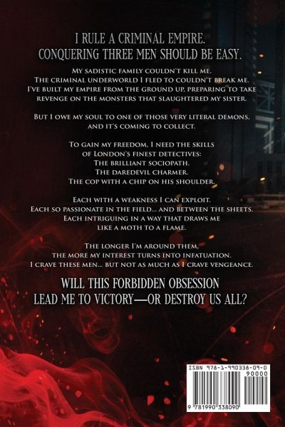 I rule a criminal empire. Conquering three men should be easy. My sadistic family couldn't kill me. The criminal underworld I fled to couldn't break me. I've built my empire from the ground up, preparing to take revenge on the monsters that slaughtered my sister. But I owe my soul to one of those very literal demons, and it's coming to collect. To gain my freedom, I need the skills of London's finest detectives: The brilliant sociopath. The daredevil charmer. The cop with a chip on his shoulder. Each with a weakness I can exploit. Each so passionate in the field... and between the sheets. Each intriguing in a way that draws me like a moth to a flame. The longer I'm around them, the more my interest turns into infatuation. I crave these men... but not as much as I crave vengeance. Will this forbidden obsession lead me to victory-or destroy us all? *Moriarty's Men a paranormal suspense series with fast-burn steam, a slow-burn enemies-to-lovers romance, and twisted schemes that'll keep you on the edge of your seat. It includes M/M content. This box set contains the complete four-book series: A Study in Seduction, The Temptation of Four, The Hounds of Desire, and The Valley of Flames.*