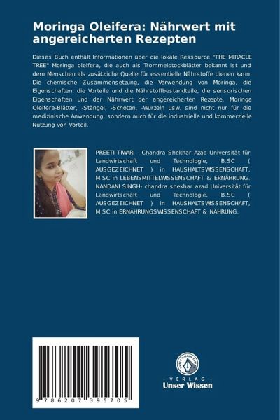 Dieses Buch enthält Informationen über die lokale Ressource "THE MIRACLE TREE" Moringa oleifera, die auch als Trommelstockblätter bekannt ist und dem Menschen als zusätzliche Quelle für essentielle Nährstoffe dienen kann. Die chemische Zusammensetzung, die Verwendung von Moringa, die Eigenschaften, die Vorteile und die Nährstoffbestandteile, die sensorischen Eigenschaften und der Nährwert der angereicherten Rezepte. Moringa Oleifera-Blätter, -Stängel, -Schoten, -Wurzeln usw. sind nicht nur für die medizinische Anwendung, sondern auch für die industrielle und kommerzielle Nutzung von Vorteil.
