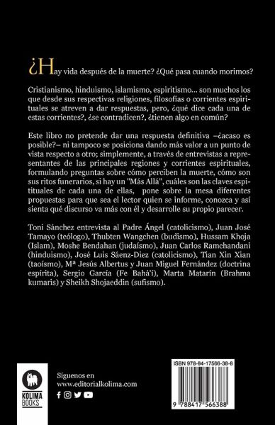 ¿Hay vida después de la muerte? ¿Qué pasa cuando morimos? Cristianismo, hinduismo, islamismo, espiritismo... Son muchos los que se atreven a dar respuestas, pero, ¿qué dice cada una de estas corrientes?, ¿se contradicen sus puntos de vista?, ¿tienen algo en común? Este libro no pretende dar una respuesta definitiva -¿acaso es posible?- ni tampoco se posiciona dando más valor a un punto de vista respecto a otro; simplemente pone en común diferentes propuestas para que sea el lector quien se informe, conozca y así sienta qué discurso va más con él y desarrolle su propio parecer. Más allá del conocimiento que desprenden las próximas páginas, como suele pasar en la mayoría de viajes, el gusto ha sido vivir el camino, contactar con personas tan diversas y poder conversar con ellas. Con independencia de la suerte que le espere a este libro, el premio ya me lo he llevado por anticipado y no podría estar más agradecido a todos y cada uno de los entrevistados.