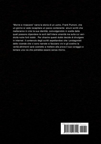 "Morire e rinascere" narra la storia di un uomo, Frank Pumoni, che un giorno si vede recapitare un pacco contenente alcuni scritti che metteranno in crisi la sua identità, coinvolgendolo in scelte dalle quali possono dipendere le sorti dell'intera umanità ma sulla cui veridicità nutre forti dubbi . Per chiarire questi dubbi decide di divulgare in internet il contenuto degli scritti aspettandosi che i protagonisti delle vicende che vi sono narrate si facciano vivi e gli svelino la verità altrimenti sarà costretto a mettere alla prova il suo coraggio e tentare una via che potrebbe essere senza ritorno.