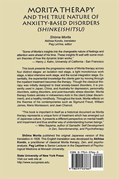 Shoma Morita published the original Japanese version of this translation in 1928. This English translation was developed by Akihisa Kondo , a practitioner of classical Morita therapy, Zen, and psychoanalysis. Peg LeVine is Senior Lecturer in the Department of Psychological Medicine at Monash University and is the only English-speaking person outside Japan practicing the classical four-stage Morita treatment.
