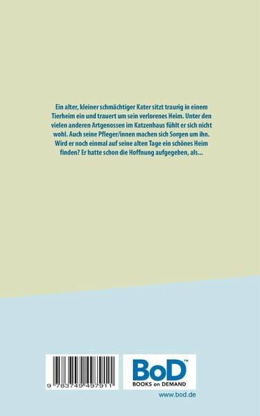 Ein alter, kleiner schmächtiger Kater sitzt traurig in einem Tierheim ein und trauert um sein verlorenes Heim. Unter den vielen anderen Artgenossen im Katzenhaus fühlt er sich nicht wohl. Auch seine Pfleger/innen machen sich Sorgen um ihn. Wird er noch einmal auf seine alten Tage ein schönes Heim finden? Er hatte schon die Hoffnung aufgegeben, als...