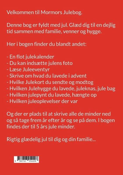 Velkommen til Mormors Julebog. Denne bog er fyldt med jul. Glæd dig til en dejlig tid sammen med familie, venner og hygge. Her i bogen finder du blandt andet: - En flot julekalender - Du kan indsætte julens foto - Læse Juleeventyr - Skrive om hvad du lavede i advent - Hvilke Julekort du sendte og modtog - Hvilken Julehygge du lavede, juleknas, jule bag - Hvilken julepynt du lavede, hængte op - Hvilken juleoplevelser der var Og der er plads til at skrive alle de minder ned og så tage frem år efter år og se på dem. I bogen findes der til 5 års jule minder. Rigtig glædelig jul til dig og din familie...